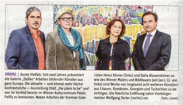 Eine Ausstellung der Kremser Galerie Daliko mit Werken von Künstlern aus Österreich, Tschechien, Rumänien, Dänemark und Litauen eröffnete NR Prof. Ewald Sacher im Österreichischen Kulturzentrum im Palais Palffy in Wien. Das Kremser Künstlerpaar Dalia Blauensteiner und Heinz Körner versammelt mit seiner Galerie Daliko einen namhaften internationalen Künstlerkreis mit Werken der Malerei und Bildhauerei. Heinz Körner war zuletzt auch Leiter des Holzbildhauersymposiums in Paudorf. Unter den zahlreichen Gästen waren daher auch Vizebürgermeister Josef Böck sowie als Vertreterin der Litauischen Botschaft Kulturattache Mag. Lina Kaiser. Sacher betonte in seiner Eröffnungsrede die friedensstiftende Bedeutung kultureller Kontakte und künstlerischen Austauschs.